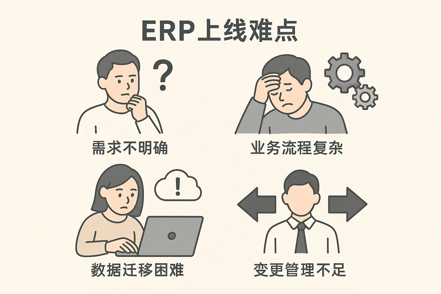 作为企业管理者,我发现ERP系统上线总是遇到各种问题,想知道具体难点主要集中在哪些方面,方便我提前做好准备。