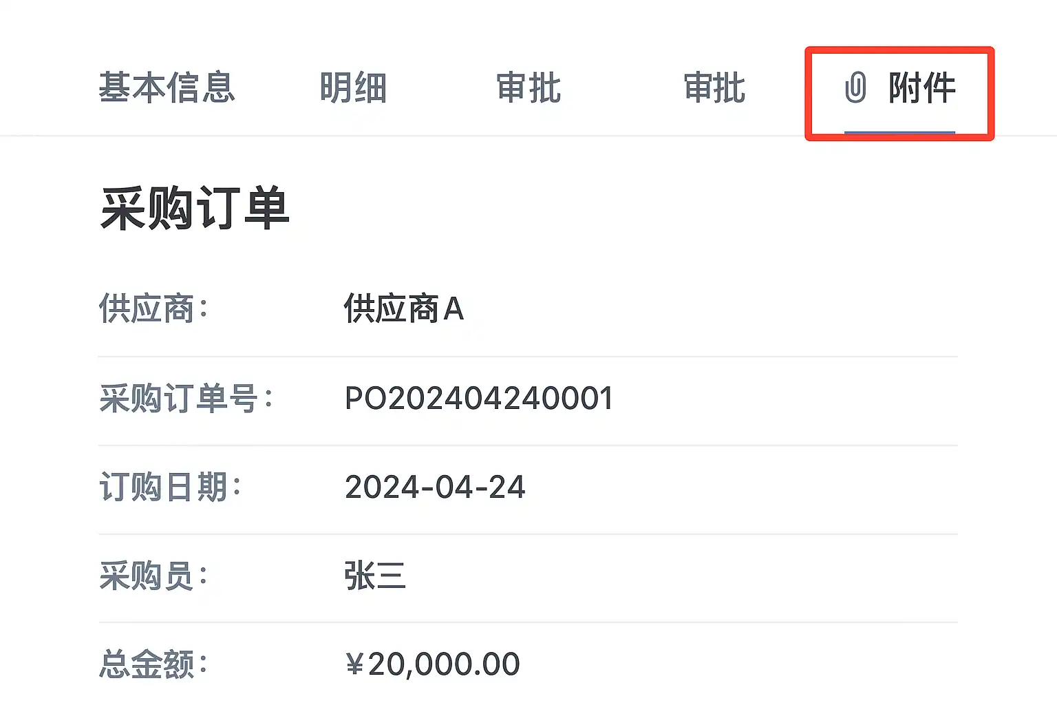 | 传统本地部署型 | 采购订单详情页 > 附件标签 | 上传/下载/删除 |