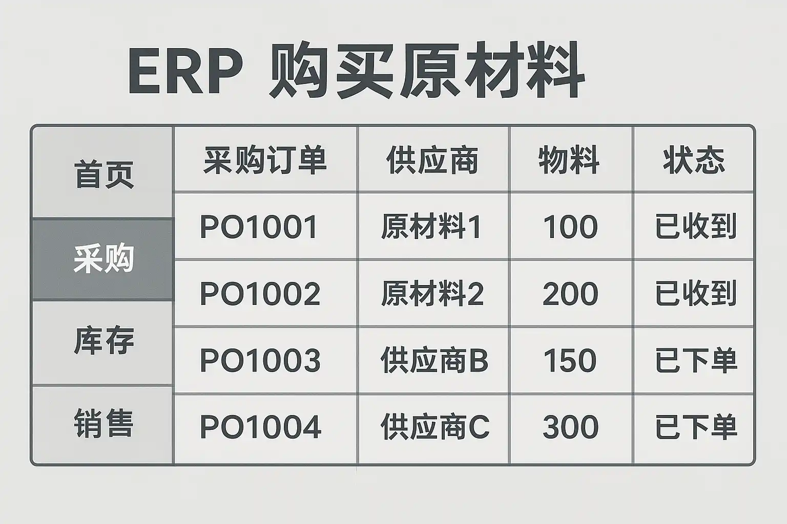 | 4 | 下达采购订单 | 在系统内生成正式PO(Purchase Order),发送给供应商 |