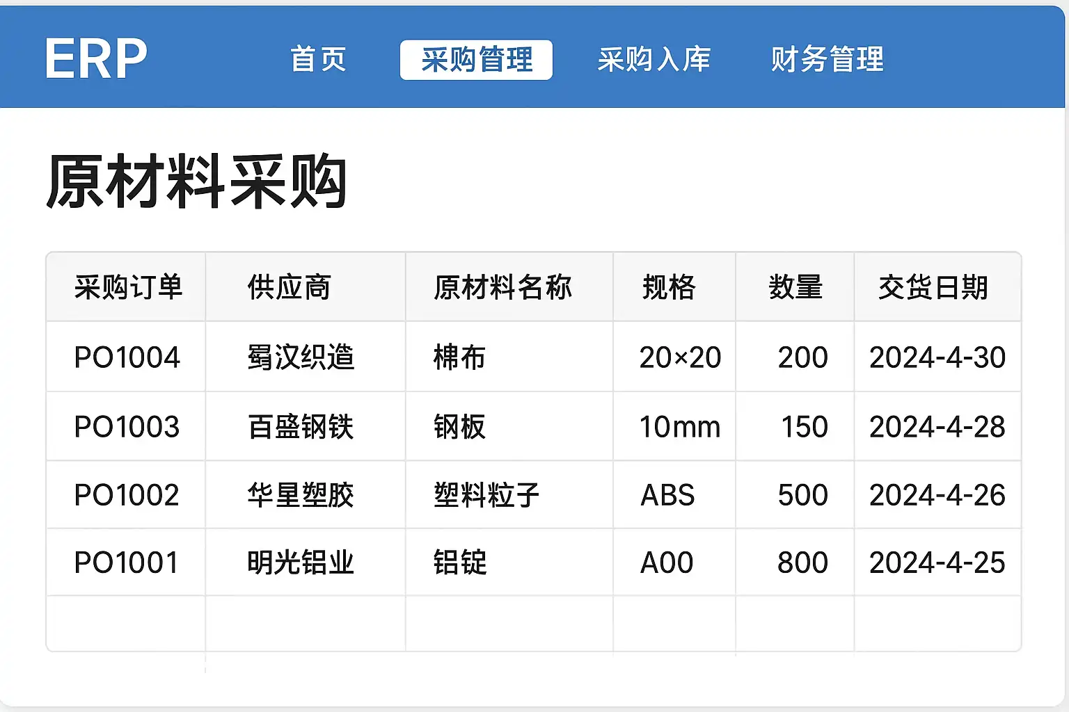 在ERP系统中,原材料采购信息通常集中在“采购管理”模块下的“采购订单”或“采购入库”子模块。通过这些模块,用户可以查看采购申请、订单详情、供应商信息及入库记录,帮助全面掌握原材料采购状态。
