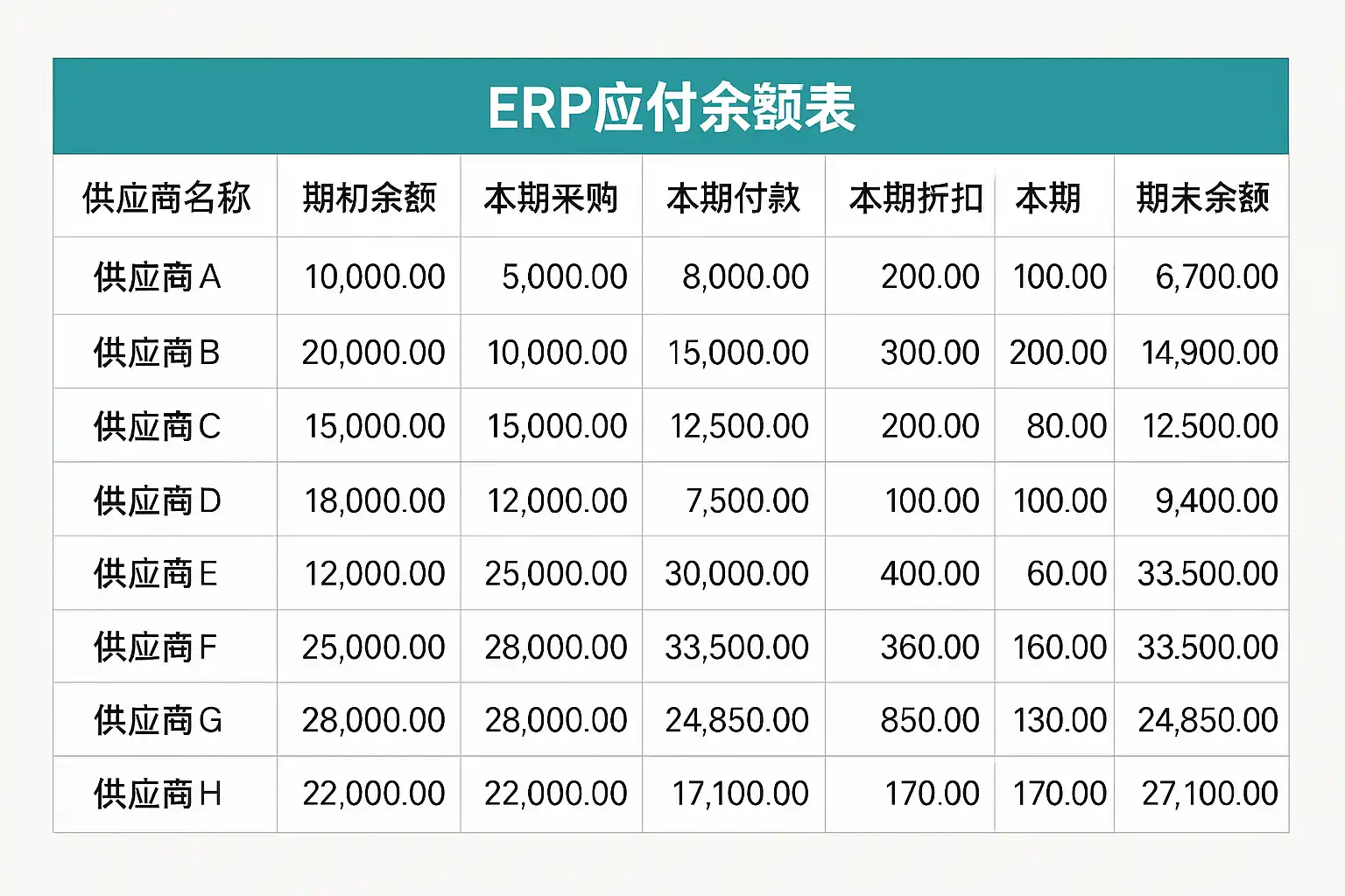 这些字段帮助企业准确掌握各供应商欠款情况及资金流动,优化现金管理与预算编制。