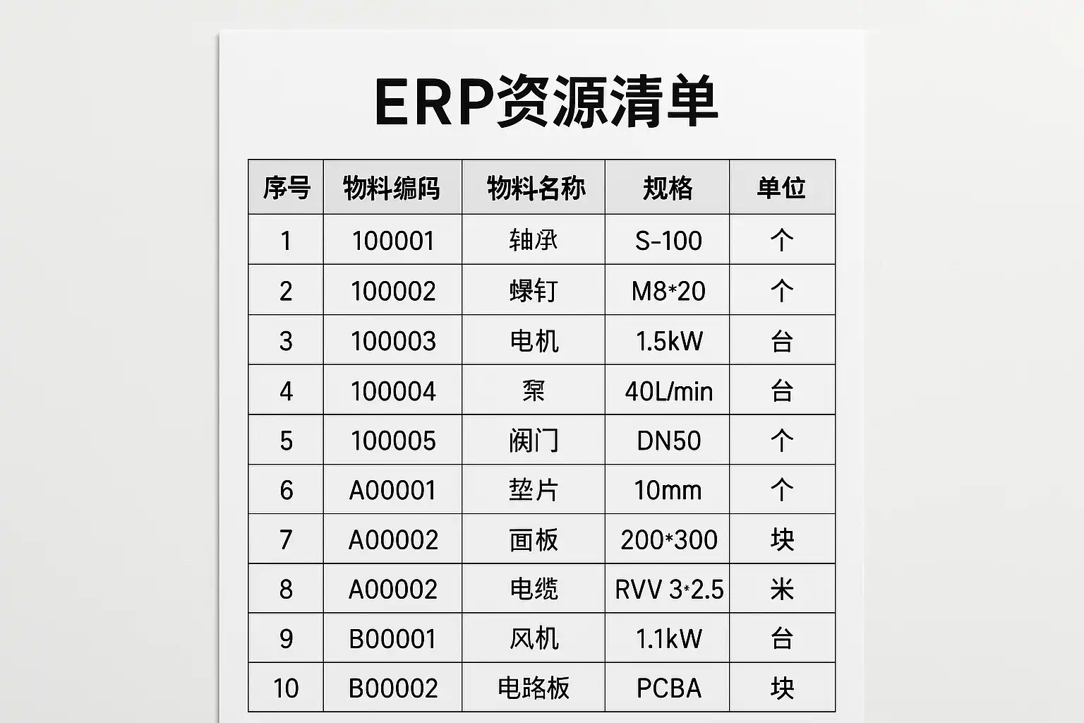 | 物料编码 | 唯一标识每个物料的编号 | A12345 |