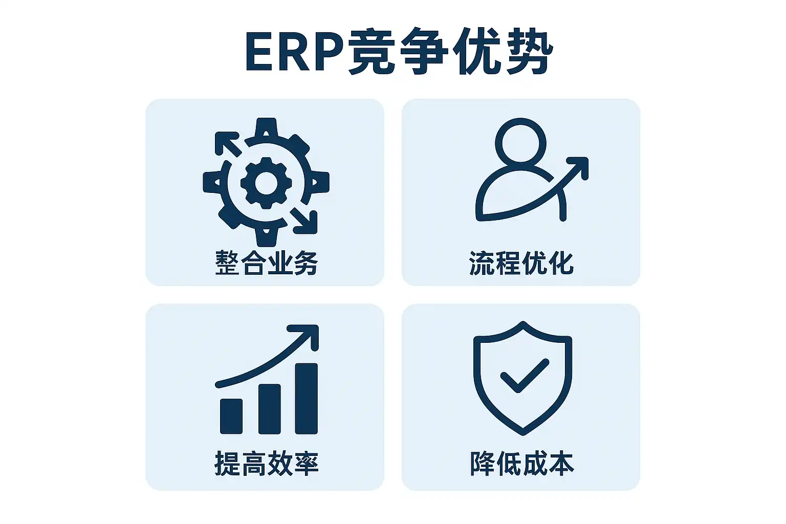 企业资源计划(ERP)系统的首要竞争优势是整合公司内部所有关键资源,优化各项业务流程,实现高效协作。其具体表现如下: