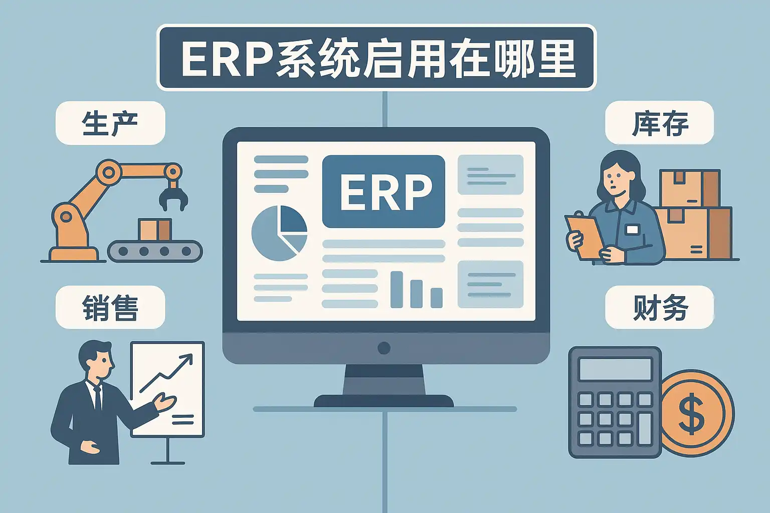 ERP(Enterprise Resource Planning,企业资源计划)是一种集成型的信息管理系统,被广泛应用于各类组织和不同业务领域。以下是ERP系统常见的启用场景及其对应业务模块: