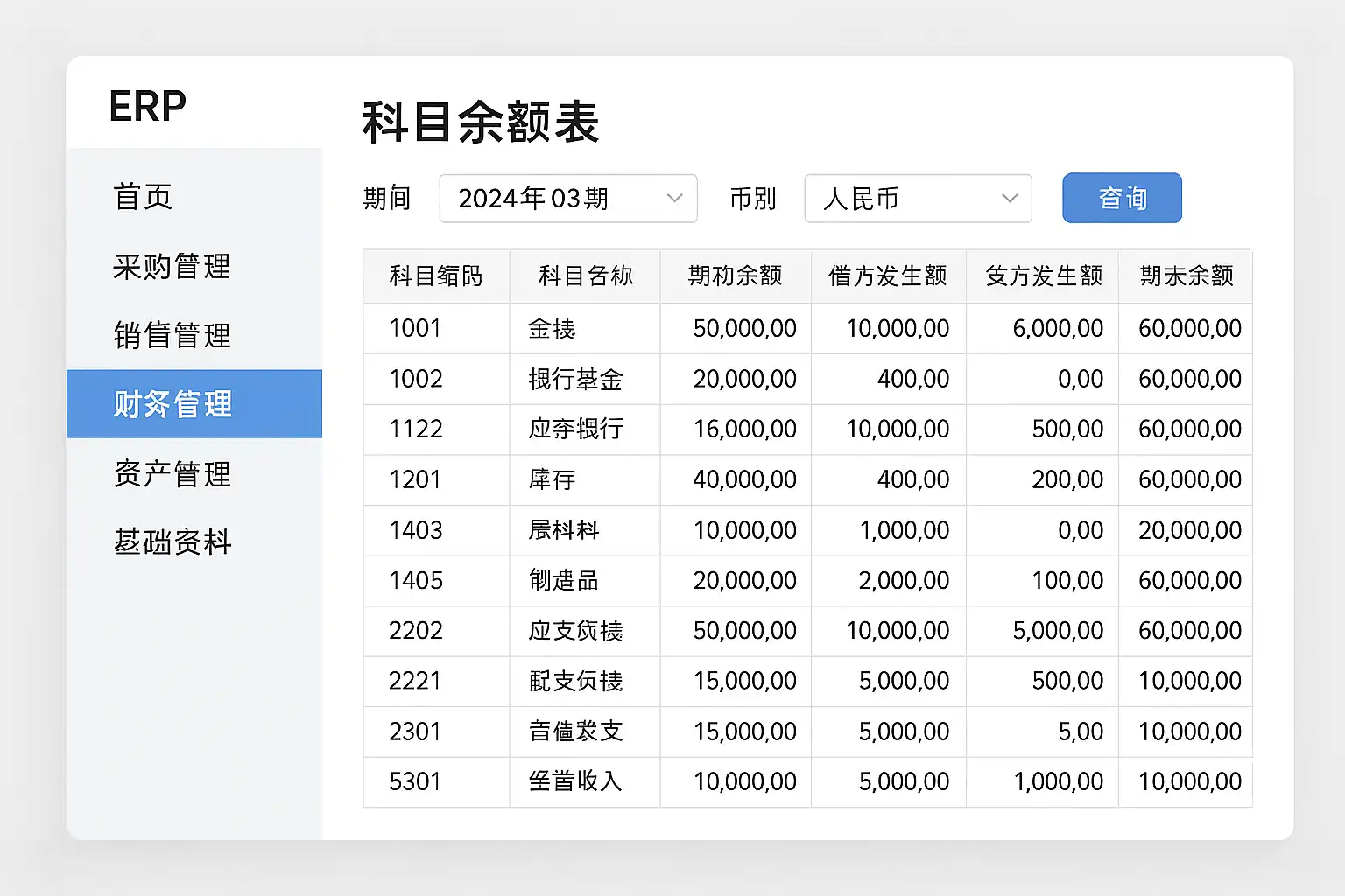 在大多数ERP系统中,科目余额表通常位于【财务管理】模块下的【总账】或【会计报表】菜单中。具体路径可能是:“财务管理 > 总账 > 报表查询 > 科目余额表”。例如,金蝶ERP在“总账”菜单下有专门的“科目余额表”选项,用户可以根据时间区间和会计期间进行筛选查看。