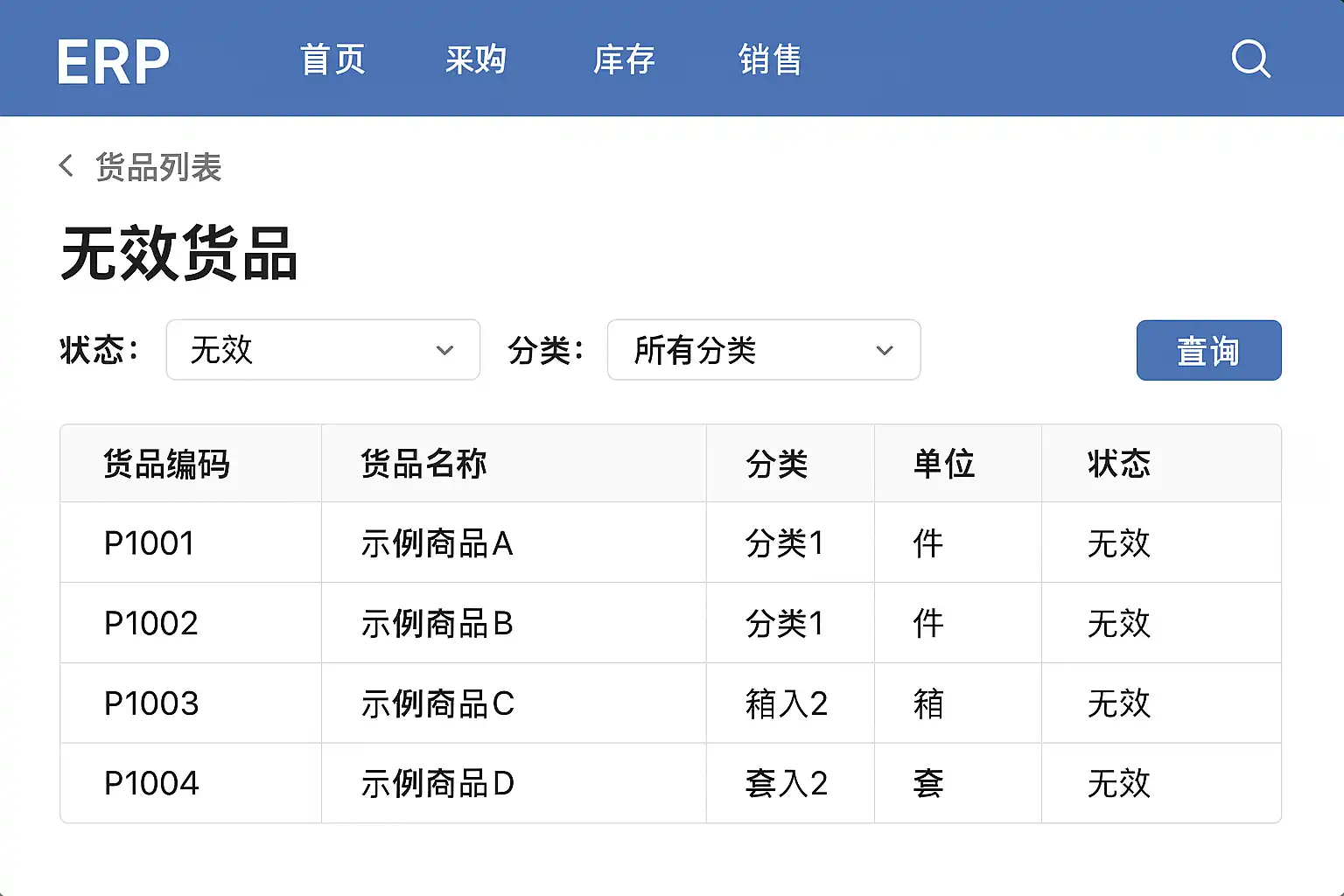 我在使用ERP系统管理库存时,发现有些货品状态显示为无效,但不知道具体在哪个模块或界面可以查看全部无效货品。想了解ERP系统中如何快速定位和查看无效货品列表。