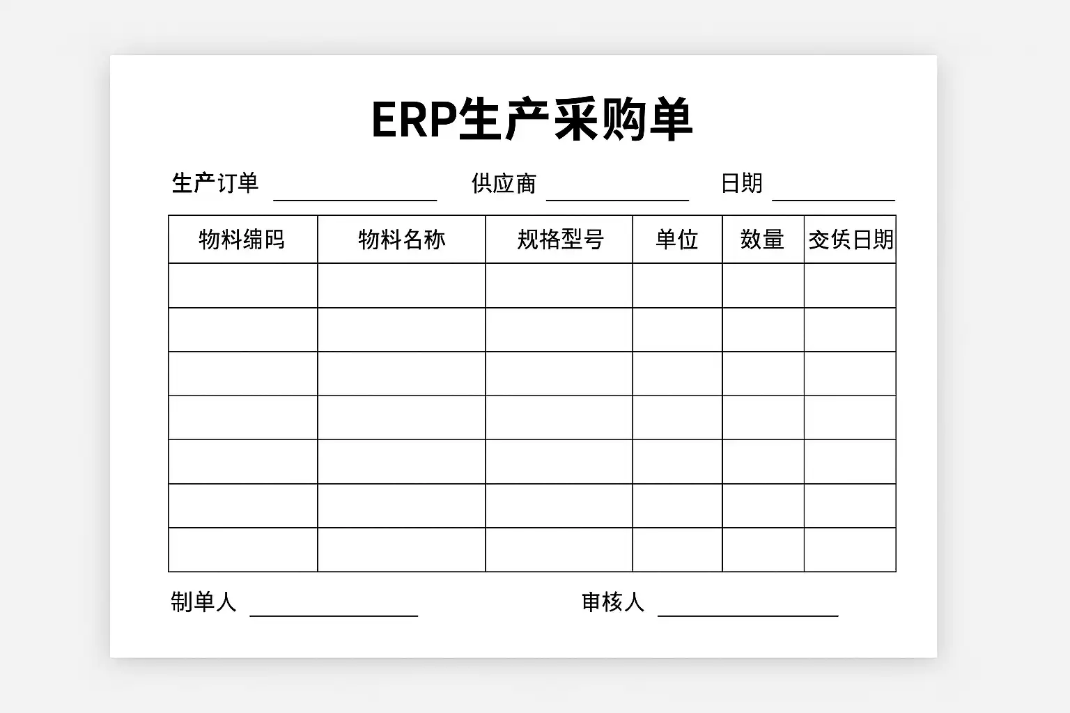 我想了解一下,一张完整的ERP生产采购单通常包括哪些重要信息?这样方便我在审核或分析时更专业。