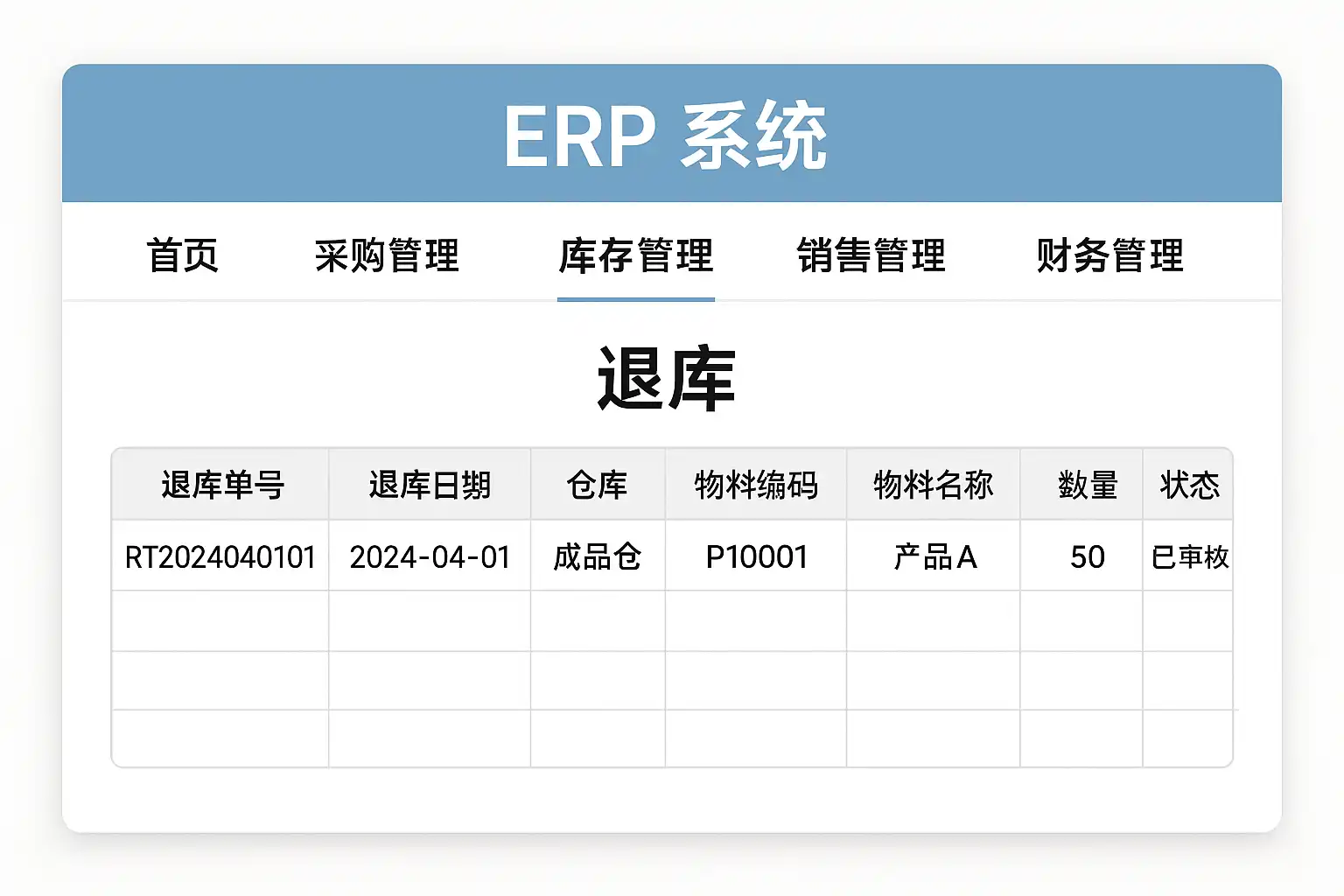 在ERP系统中,退库记录一般集中显示在“库存管理”或“仓库管理”模块下的“退库单”或者“出入库明细”页面。具体路径通常为: