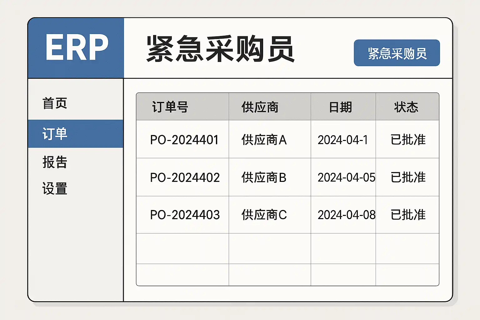 不同品牌的ERP系统设置紧急采购员的位置可能略有差异,但其核心逻辑基本一致。下表汇总了主流做法: