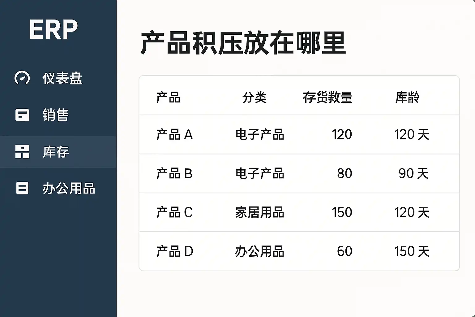- 呆滞库存:连续N天(如90/180/365)无收发动作;
