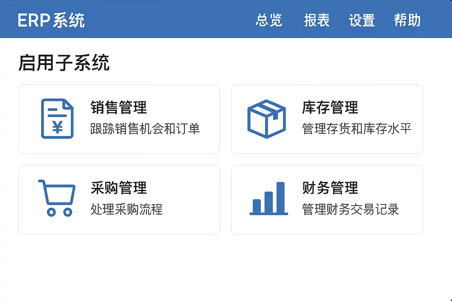 ERP(Enterprise Resource Planning, 企业资源计划)是整合企业内部各部门流程的信息化平台。一个完整的ERP由多个子模块(又称“子系统”)组成,如财务、采购、销售、库存、人力资源等。每个子系统承担特定业务职能,共同支撑企业整体运营。