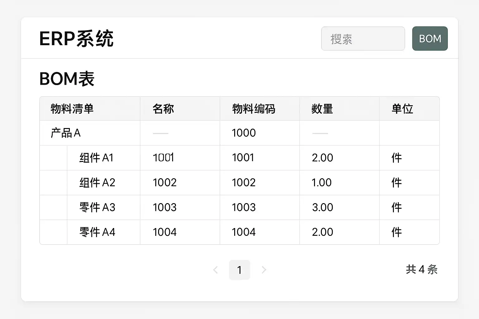 - BOM(Bill of Materials),即物料清单,是描述产品组成结构的核心文档。