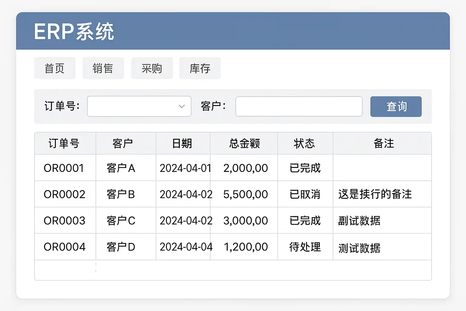 实现ERP系统中文本字段自动换行,常用技术包括前端HTML/CSS及后台配置。 示例:
