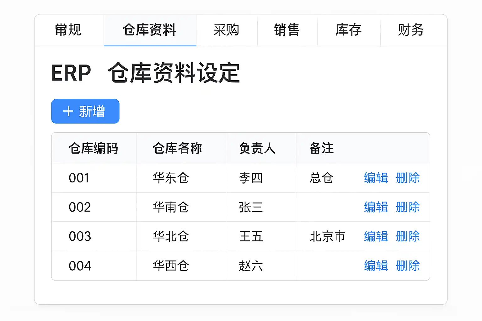以某知名ERP系统为例,路径是【基础资料】→【库存管理】→【仓库设置】,通过该页面完成所有仓库信息的添加与维护。