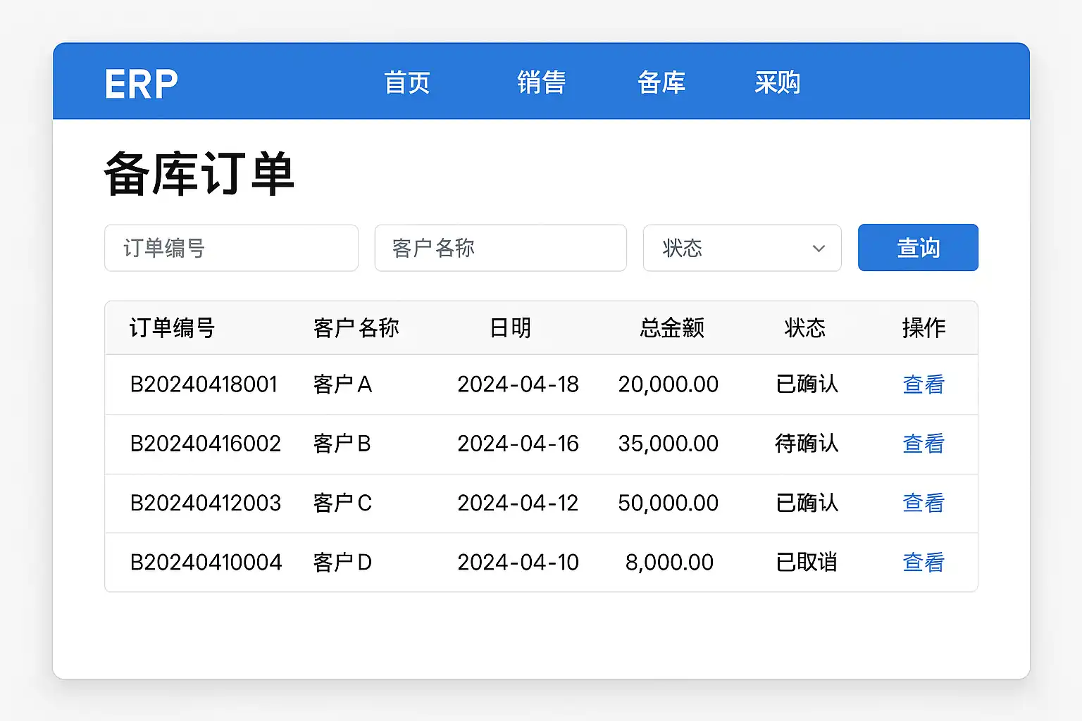 大多数ERP系统提供了多维度筛选和搜索功能来快速查找已下的备库订单。常见方法包括: