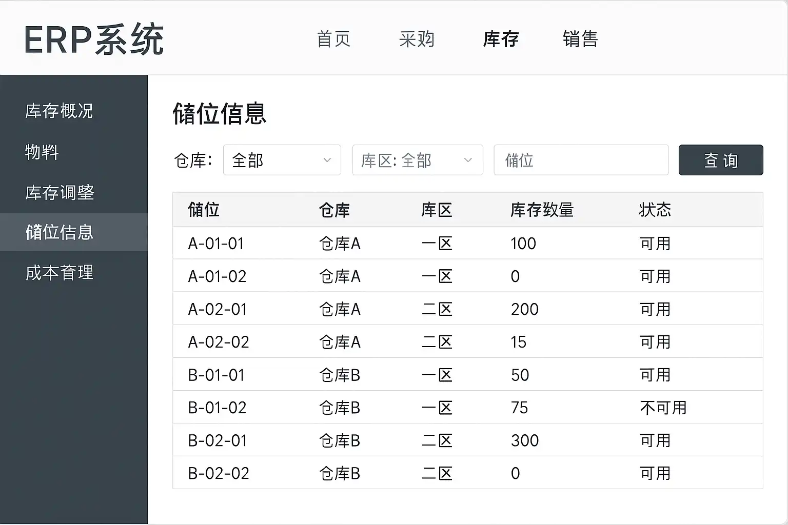 大部分ERP系统支持通过输入具体储位编号快速定位和查询库存详情。操作步骤通常是:进入‘库存查询’模块 → 输入目标储位编号 → 系统即时显示该储位的物料种类、数量、批次等信息。此功能大幅提升查找效率,尤其适用于大型仓库,实现精准库存管控。