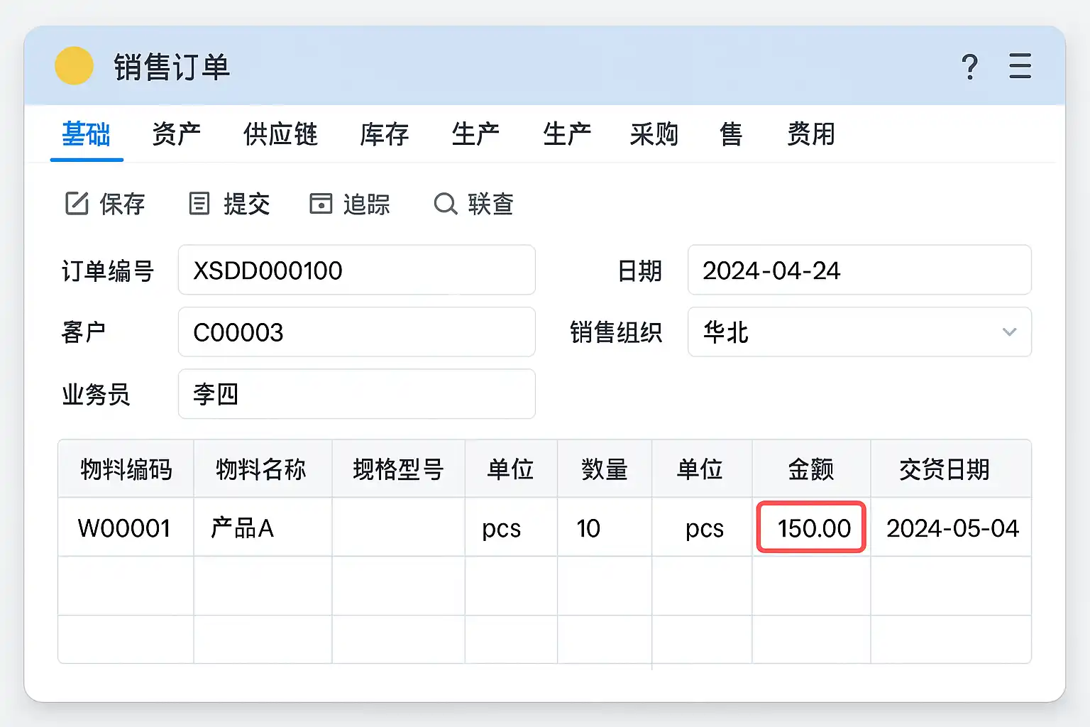 | 采购管理 | 入库/订单 | 明细行:“物料编码”-“数量”-“单位”-“单价”-“金额”等列 |