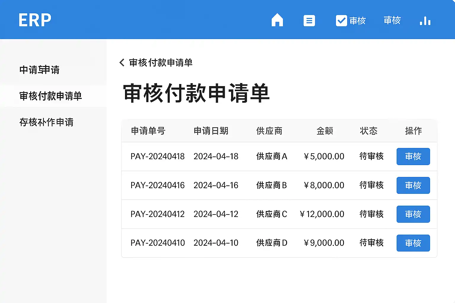 不同品牌和类型的ERP系统,虽然界面和操作习惯各异,但付款申请单的审核操作普遍集中在以下几个位置: