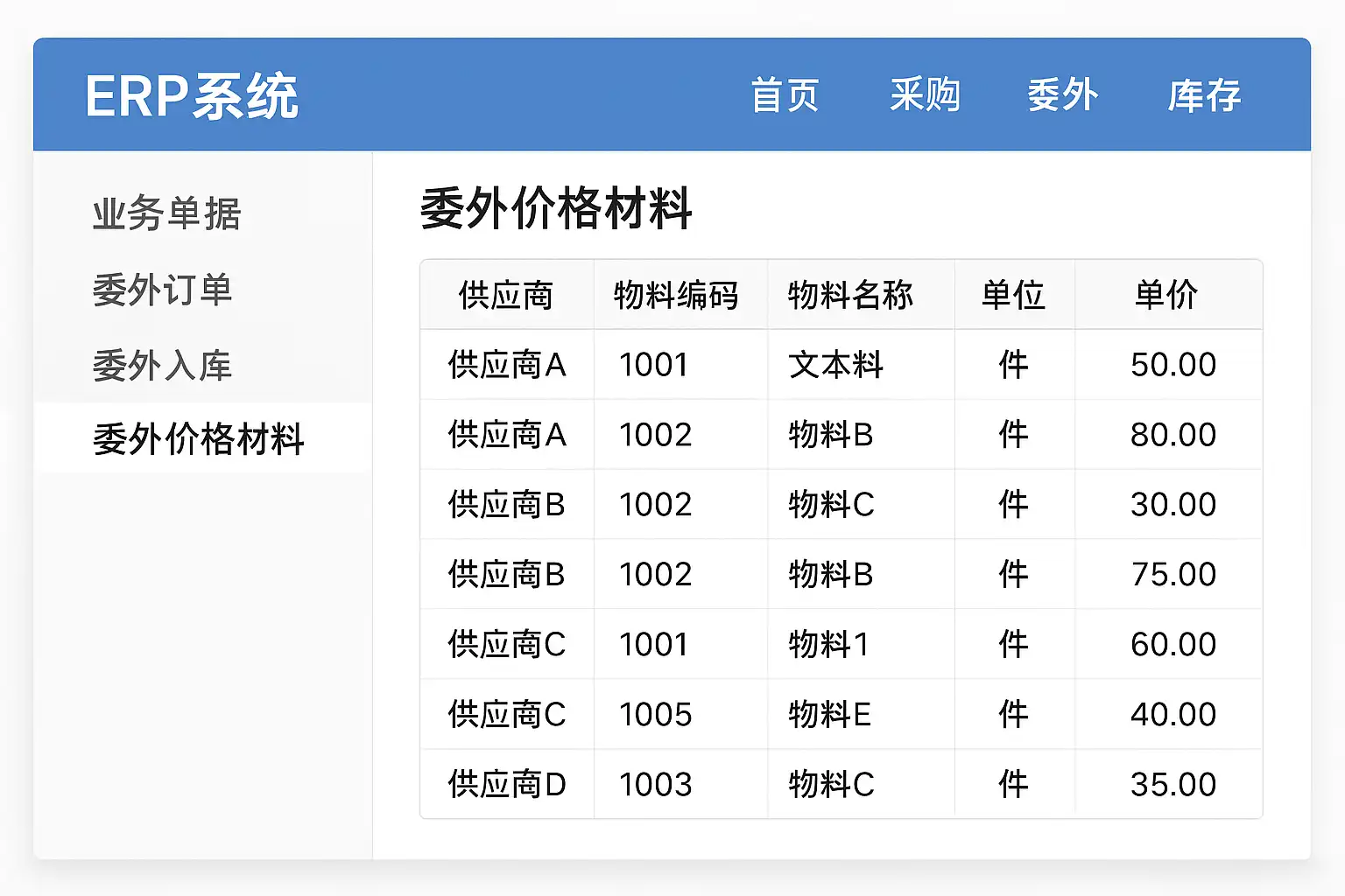 我在使用ERP系统时,想要找到委外价格材料的具体数据位置,但是界面复杂,找不到入口。请问ERP系统中委外价格材料通常存储在哪个模块或页面?