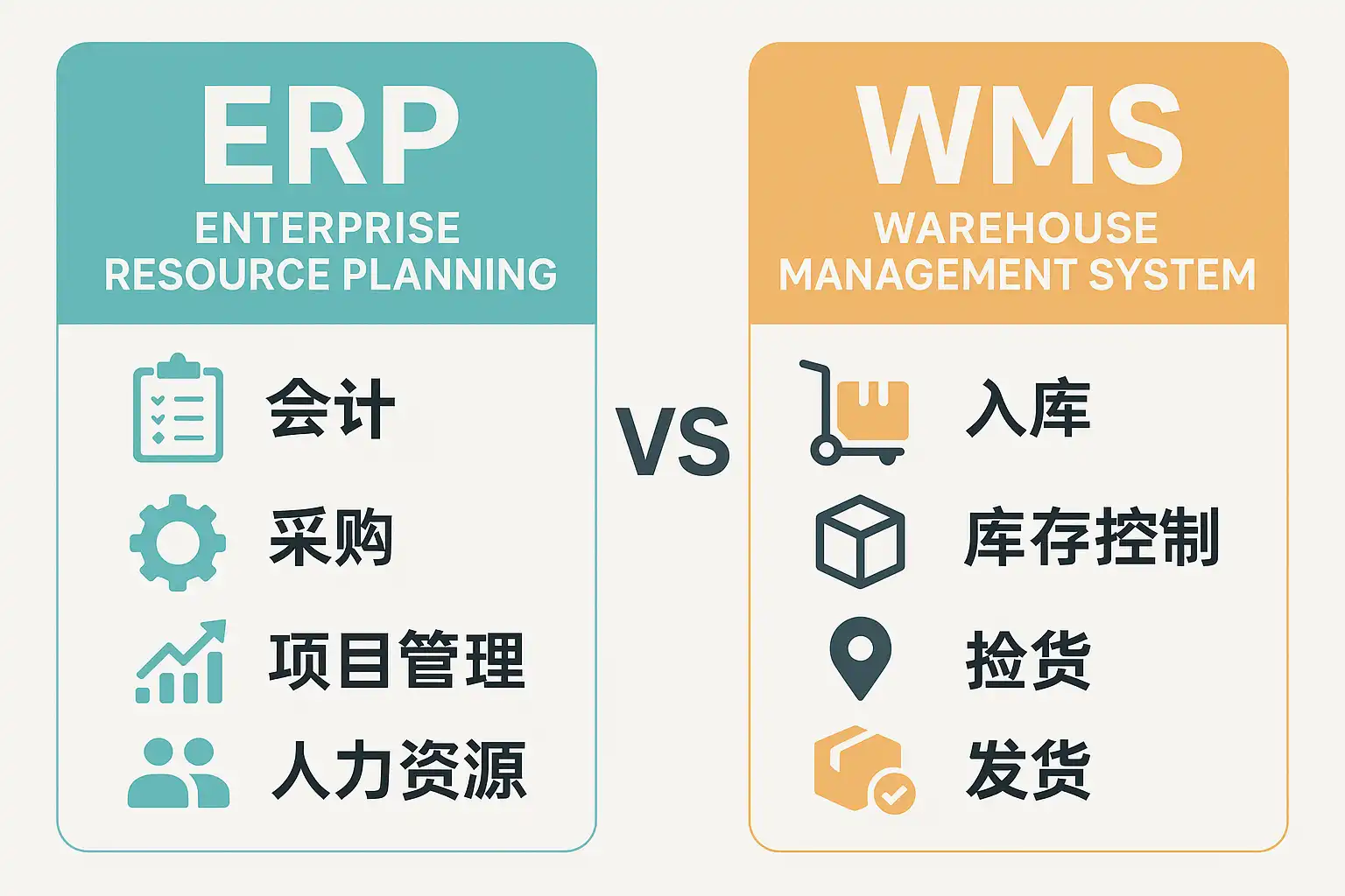 ERP(企业资源计划)和WMS(仓库管理系统)的核心区别在于业务范围和功能侧重点: