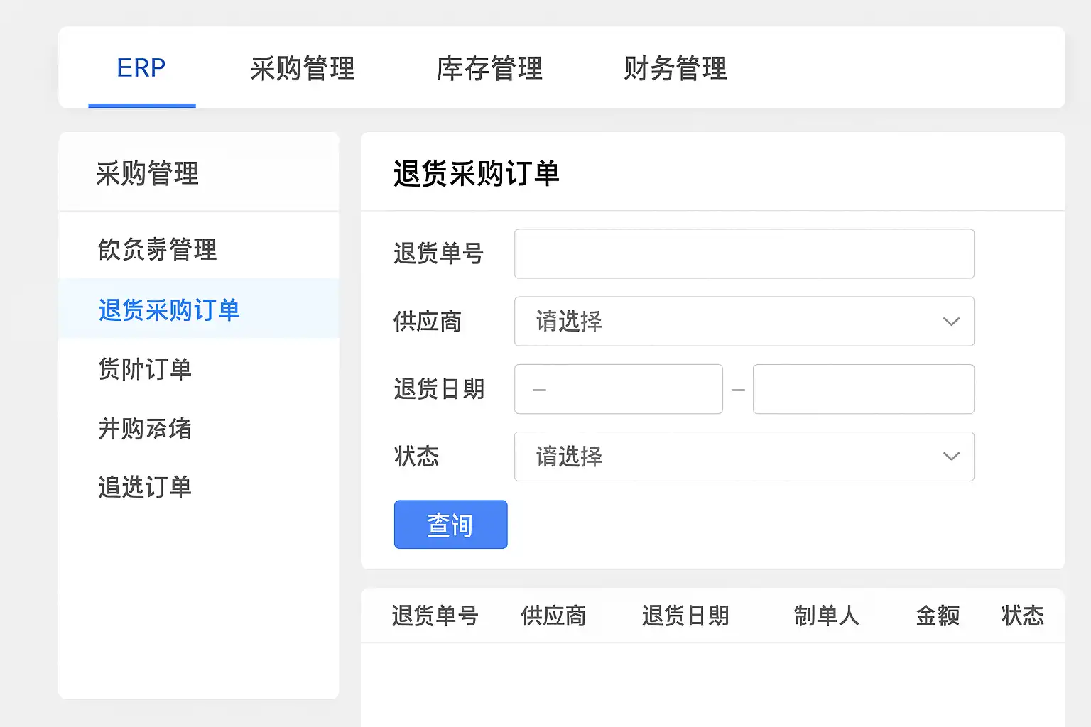 在ERP系统中,退货采购订单一般集中管理在“采购管理”模块下的“退货订单”或“采购退货”子菜单中。不同ERP系统界面有所差异,但通常路径为: