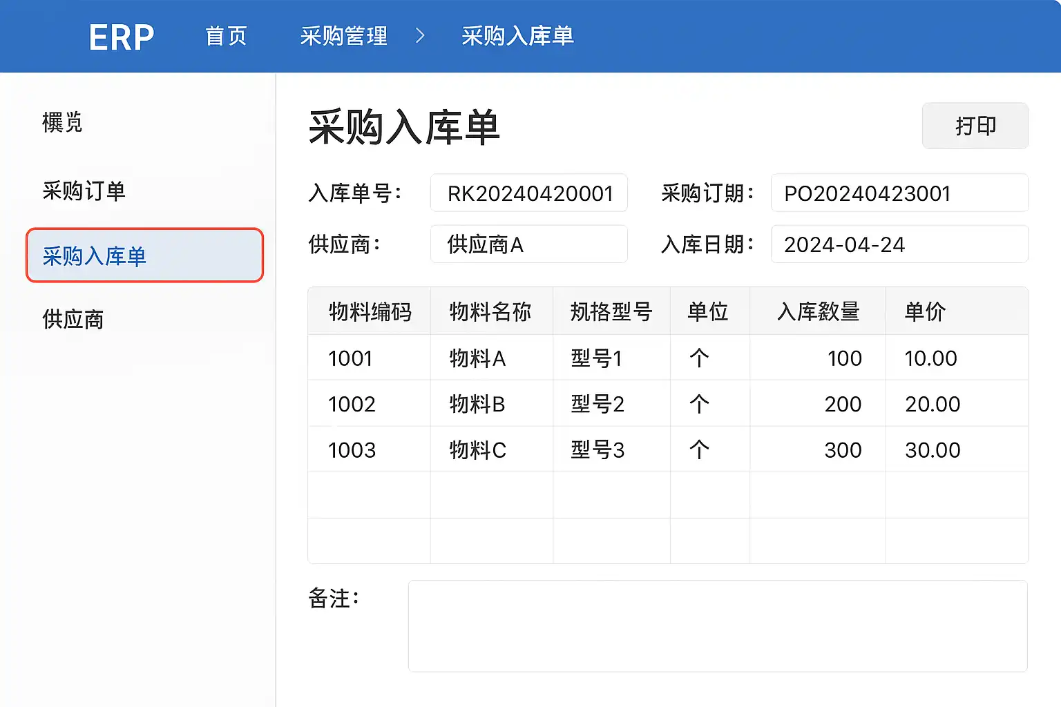 标准的ERP采购入库单一般包含以下关键信息: