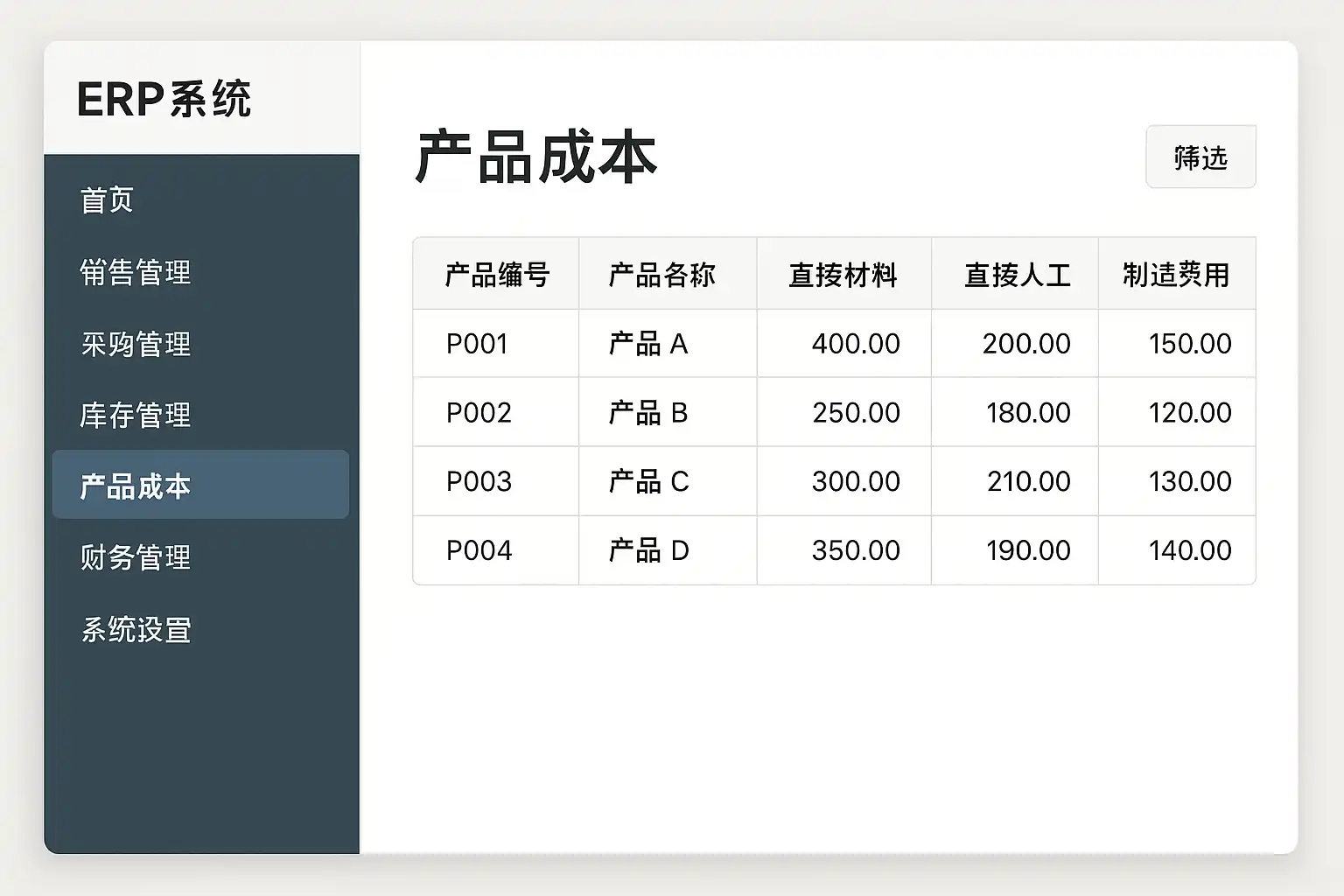 不同厂商或行业版ERP,对“产品成本”的呈现方式存在差异。以下为常见几种情况: