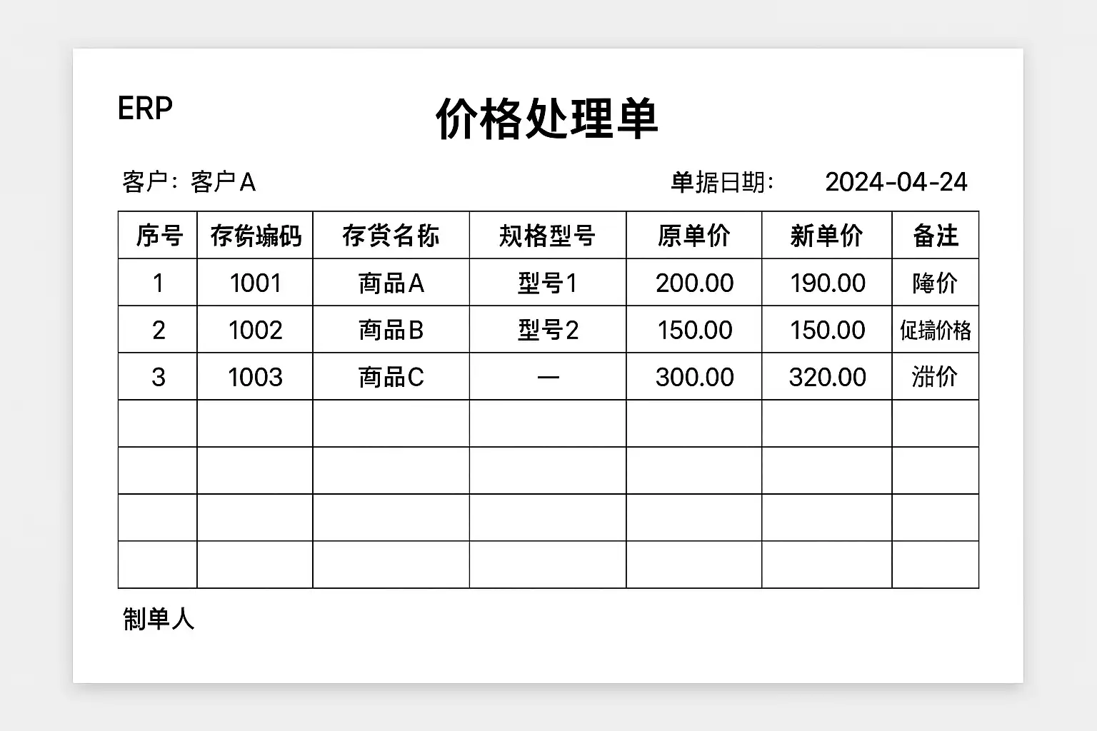 ERP(Enterprise Resource Planning)系统中的“价格处理单”通常指记录商品或服务定价变动、审批及执行细节的业务单据。它广泛用于如下情形: