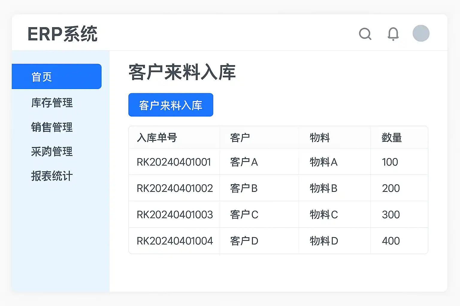 在ERP系统中,客户来料入库通常通过“采购管理”或“仓储管理”模块完成。具体步骤包括: