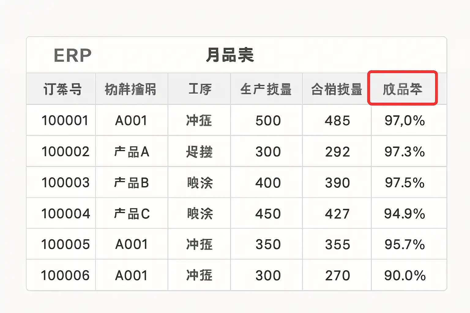 常见存放位置 | 表名 | 字段名称/位置 | 说明 | |------------------|--------------------|------------------------------| | 工单明细表 | 成品数/投入数 | 有时直接有“成品率”字段 | | 生产日报 | 合格数/总产数 | 可通过计算得出 | | 质量检验记录 | 检验合格比 | 包含每批次检验合格比例 | | 批次追踪台账 | 批次产量及合格数 | 用于追溯不同批次差异 |
