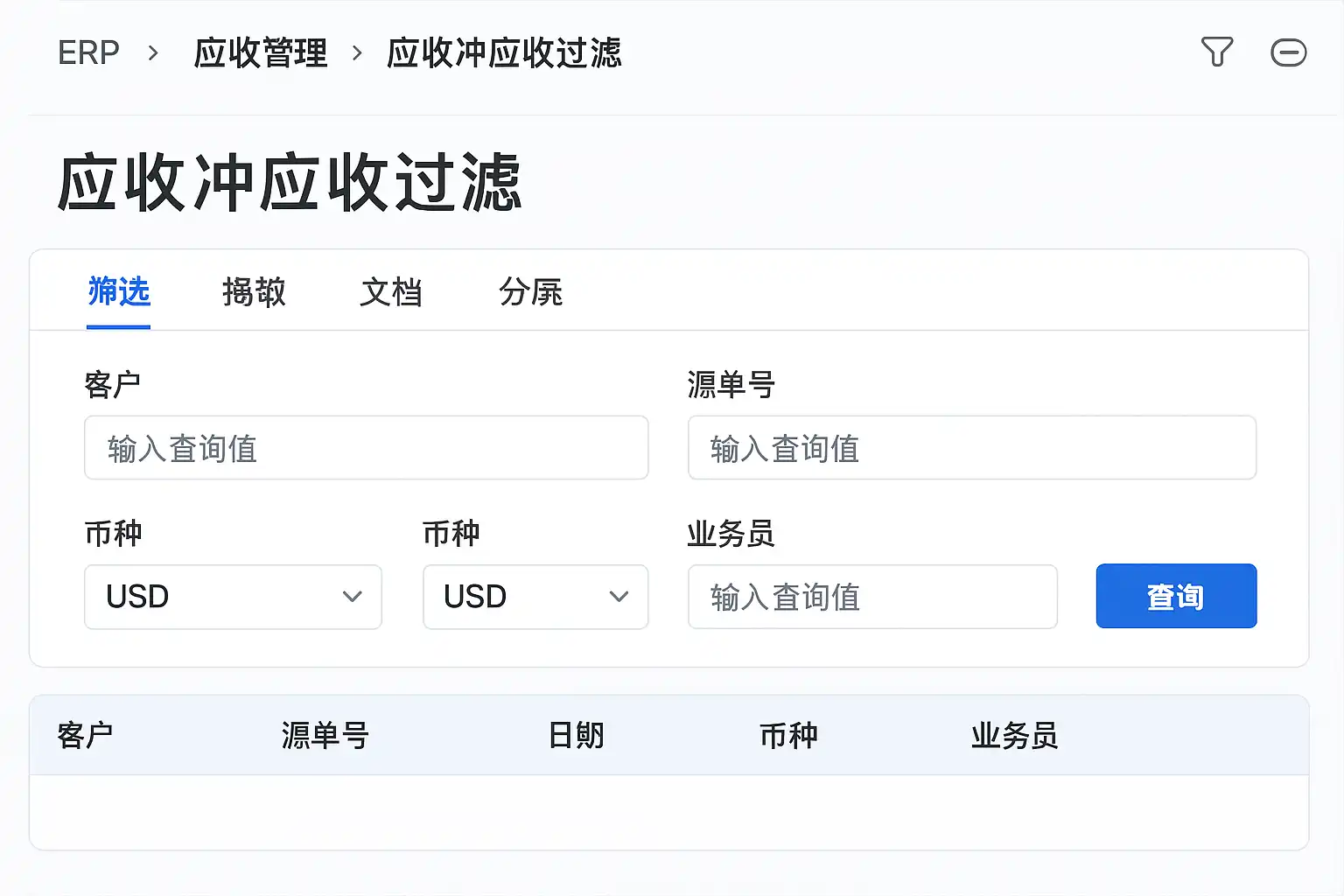 常见的ERP系统中,应收冲应收有以下核心过滤条件: