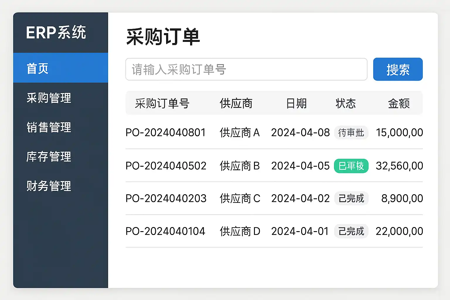 ERP系统通常会为采购订单设定多种状态,如“草稿”、“待审批”、“已批准”、“执行中”和“已完成”。在“采购订单查询”界面,可以通过“状态”筛选器选择所需类别。此外,大多数系统会用颜色标签或者图标区分不同状态。例如:绿色表示已批准,黄色表示待审核。根据某大型企业数据统计,通过颜色分类帮助员工减少了25%的误操作率。