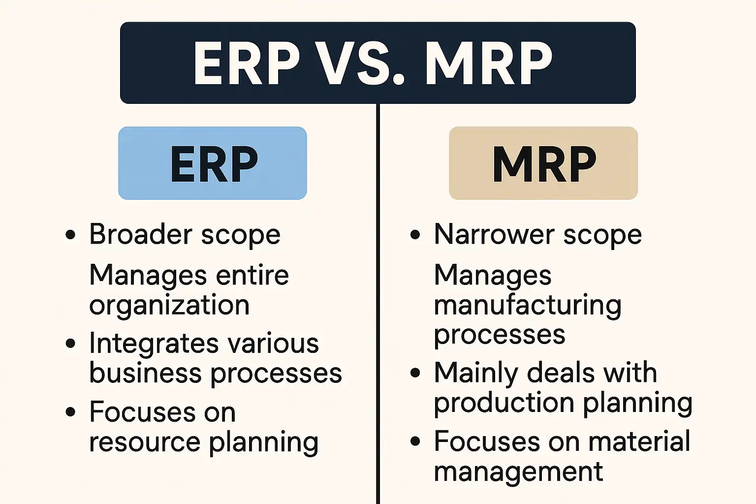 - 扩展性: ERP模块可按需增加或定制,更灵活应对业务变化; MRP功能相对固定。