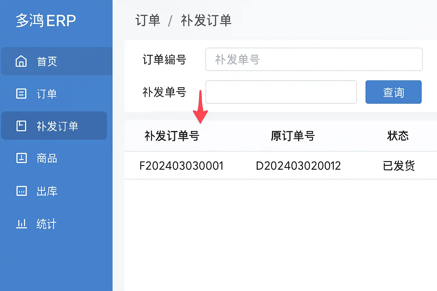 我在使用多鸿ERP系统时,需要查询补发单号,但找了半天也没找到具体位置。补发单号一般存储在哪个模块或者页面,怎么快速定位?