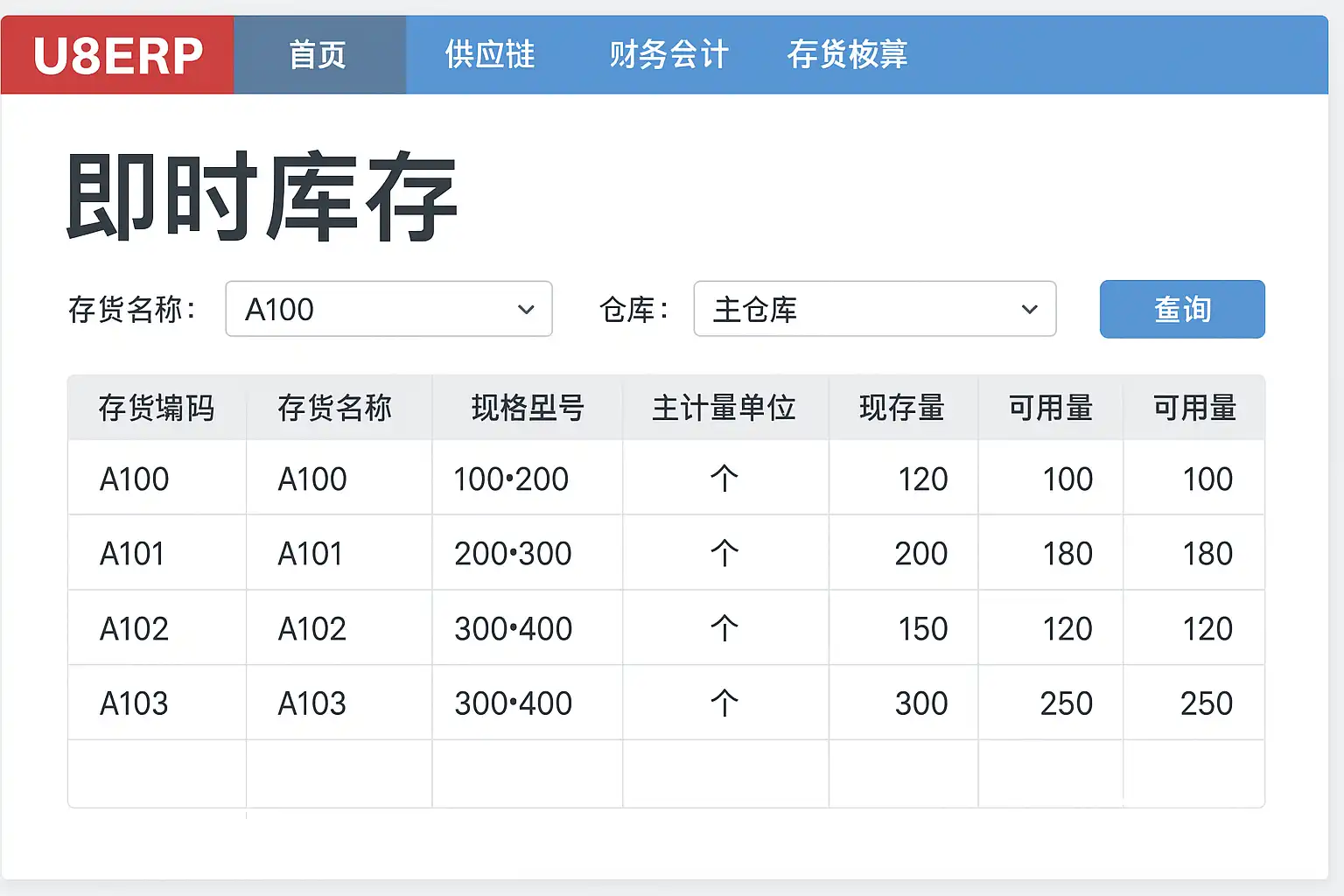 在u8erp系统中,即时库存通常位于【库存管理】模块下的【库存查询】或【即时库存】子菜单中。用户可以通过导航栏进入“库存管理”,然后选择“即时库存”查看当前各仓库的实时库存数据。系统通过实时更新库存变动,确保数据显示的准确性。例如,某公司通过该功能实现了99.5%的库存准确率,有效避免物料短缺和积压。