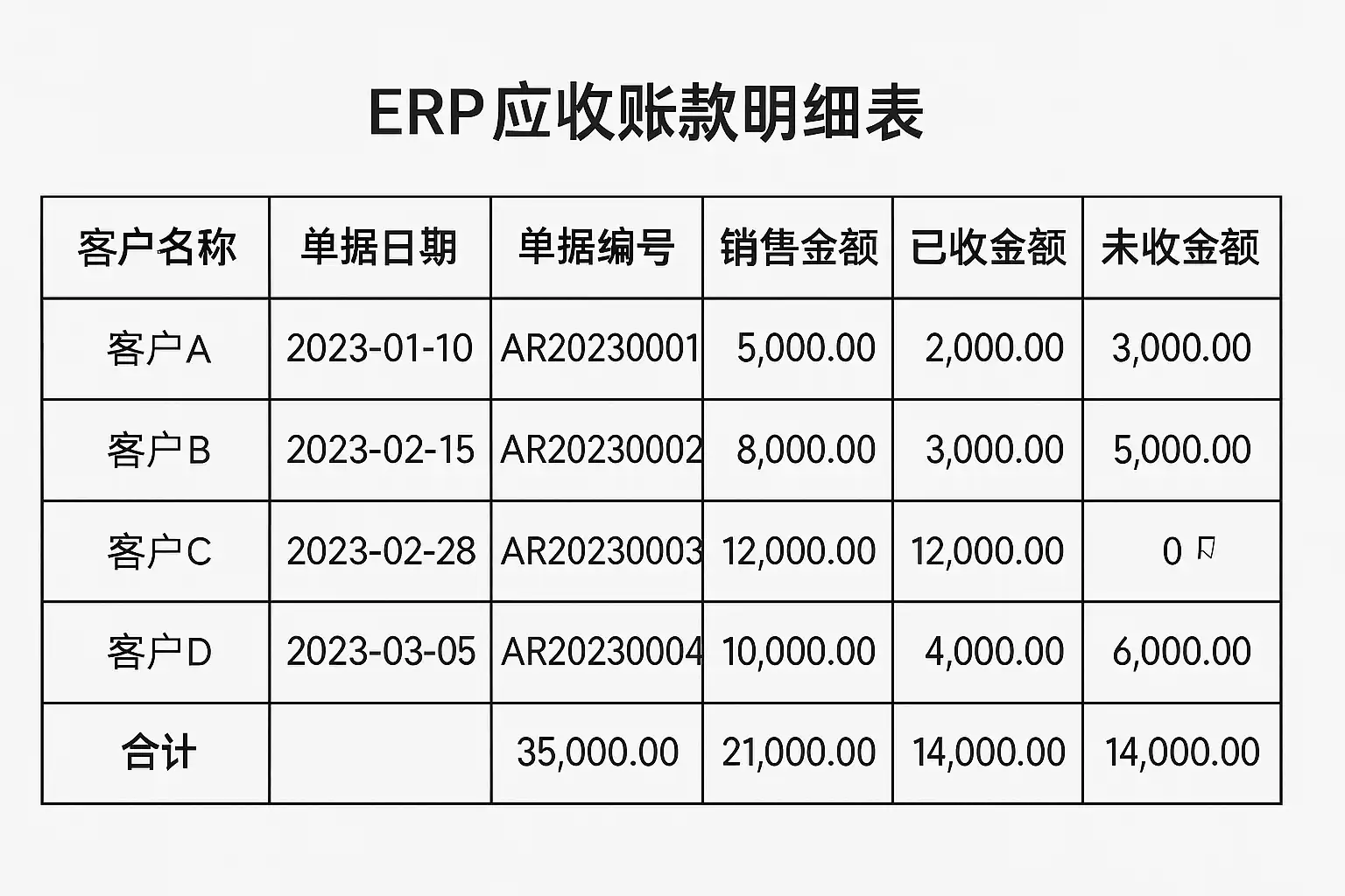 - 应收账款明细表,是企业在使用ERP(Enterprise Resource Planning,企业资源计划)软件进行财务管理时,经常需要查阅的重要报表。它详细记录了每个客户的销售收入、发票信息、回款情况及尚未结清的具体账目。