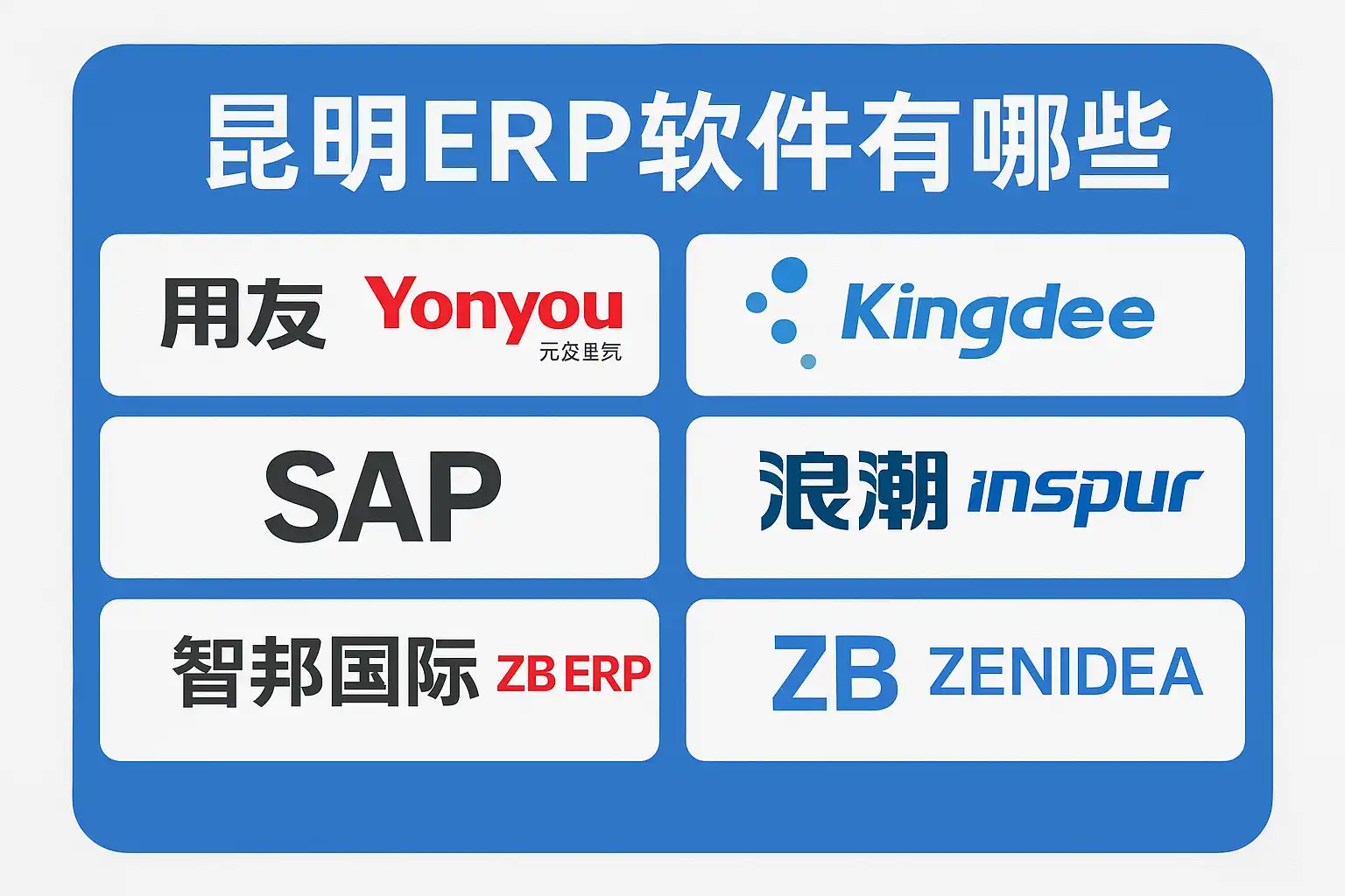 国内大型知名ERP厂商在昆明均设有服务网点或授权代理,覆盖大中型与成长型企业用户。常见品牌包含: