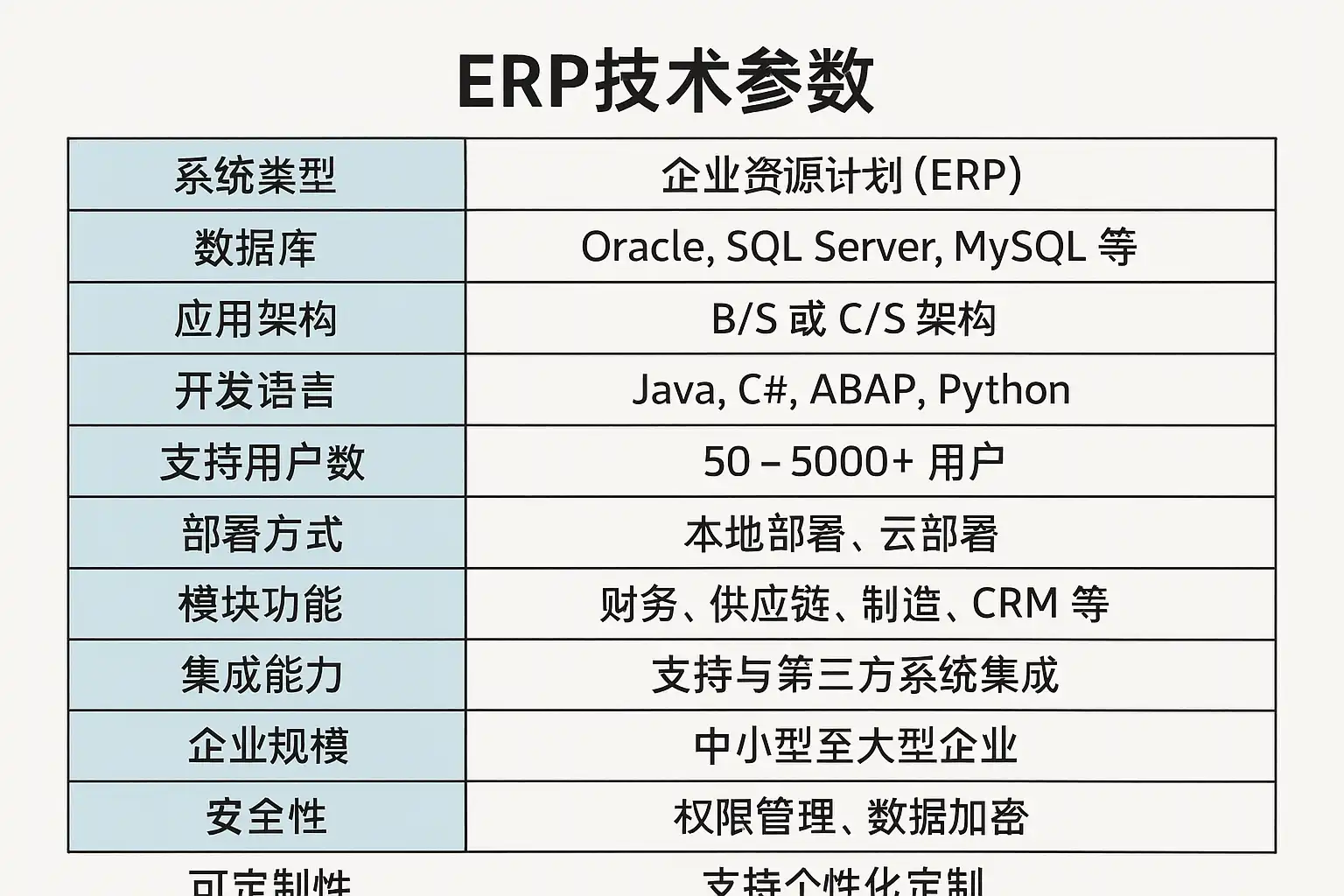 ERP(Enterprise Resource Planning)技术参数涵盖了从基础硬件到软件层面的所有关键配置。企业在选型或实施ERP时,必须全面评估这些参数,以确保系统能够满足业务需求并具备良好的可持续发展能力。