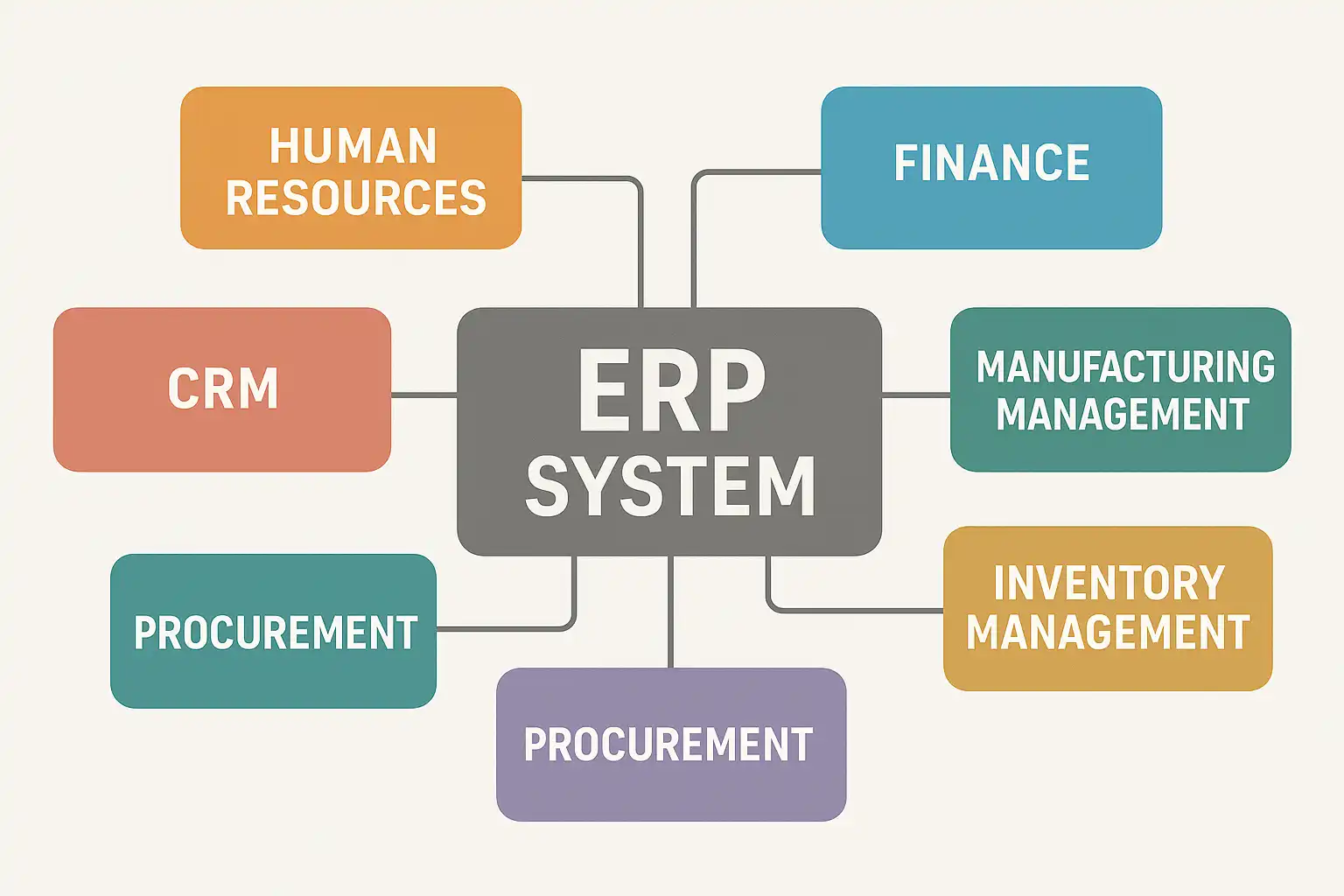 ERP(Enterprise Resource Planning,企业资源计划)系统通过多种功能模块集成企业的业务流程。典型的ERP系统通常包含以下几个主干业务板块: