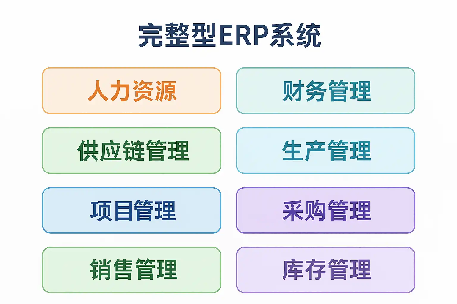 完整型ERP(Enterprise Resource Planning)系统是指能够覆盖企业全业务流程管理需求的信息化平台。它不仅仅是单一部门的软件,而是整合了采购、销售、库存/仓储管理、生产制造、人力资源(HR)、财务会计与资产管理等多个核心模块,实现数据共享和业务协同。