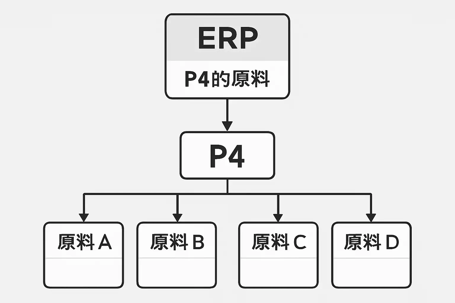 不同企业和不同定义下的P4,其具体原材料明细会有差异,但原则上都需通过BOM(Bill of Material)在ERP内标准化配置。