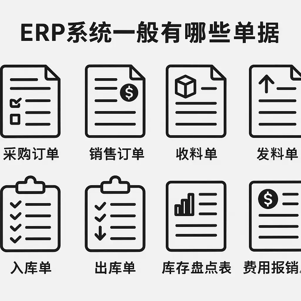 ERP系统根据企业各个业务环节的需求,设计了多种标准化和自定义化的业务单据。这些单据是记录和管理各项业务活动的核心载体。下面按功能模块对常见ERP单据进行分类:
