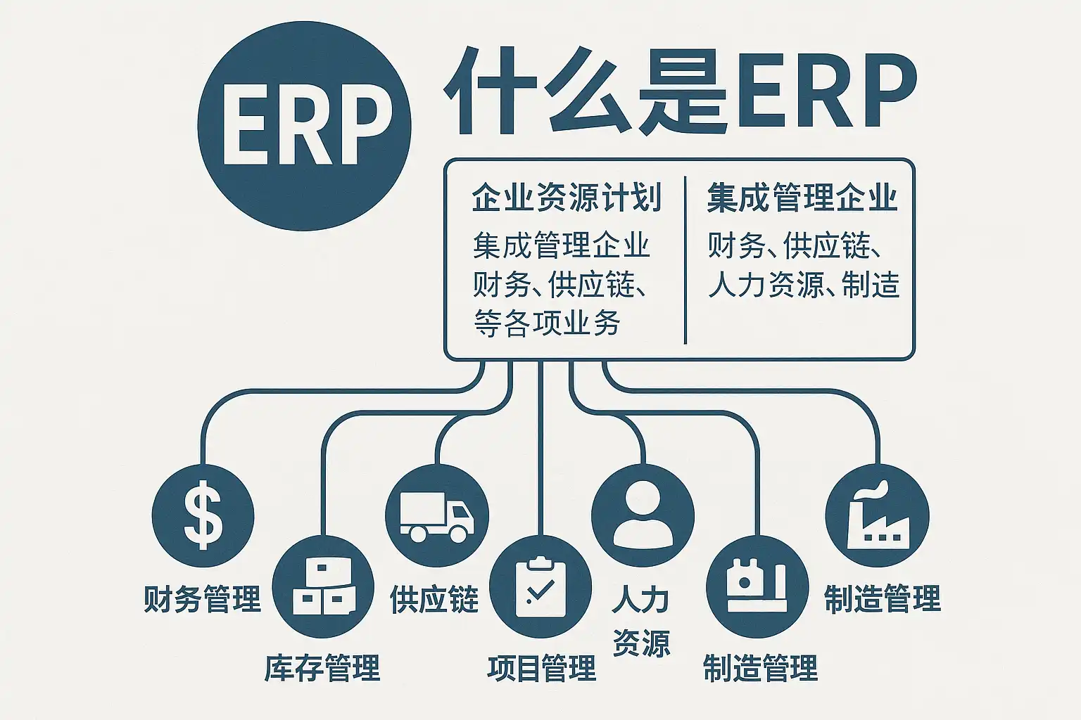 ERP(Enterprise Resource Planning),即企业资源计划,是指通过信息技术将企业内部涉及物流、资金流、信息流等各个环节进行整合,以提升整体经营效率和市场竞争力的软件系统。其核心是以“计划”为中心,把供应链中的各环节连接起来,形成完整的信息闭环。