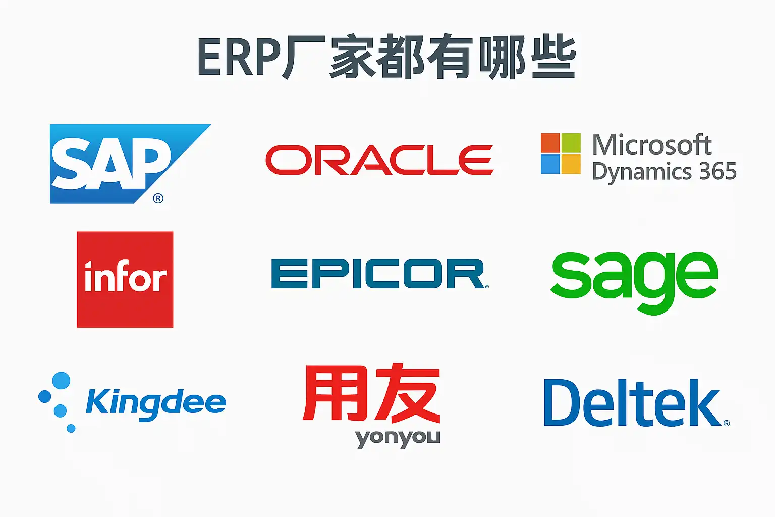|类别|厂商品牌|典型用户群|备注| |---|---|---|---| |国际龙头|SAP, Oracle, Microsoft Dynamics |跨国集团、大型央企 |广泛应用于全球500强| |国内龙头 |用友, 金蝶, 鼎捷 |大型民企、本地上市公司 |政策敏感度强| |新锐SAAS |简道云, 畅捷通 |创新创业型、小微中企 |低门槛灵活配置| |细分垂直 |致远互联, 蓝凌软件(OA+流程), 华天动力(人事), 明基逐鹿(医药生产), 智邦国际(工程项目信息)、管家婆软件(批发零售)、海致BDP(二次开发BI+报表) 等 |特定专业领域用户 |满足深层特殊需求|