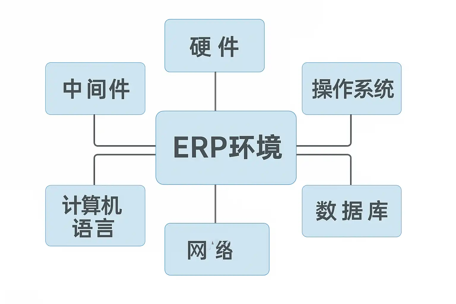 软件环境是保证ERP功能实现与业务扩展的重要支撑,包括操作系统、中间件、数据库及应用程序等。