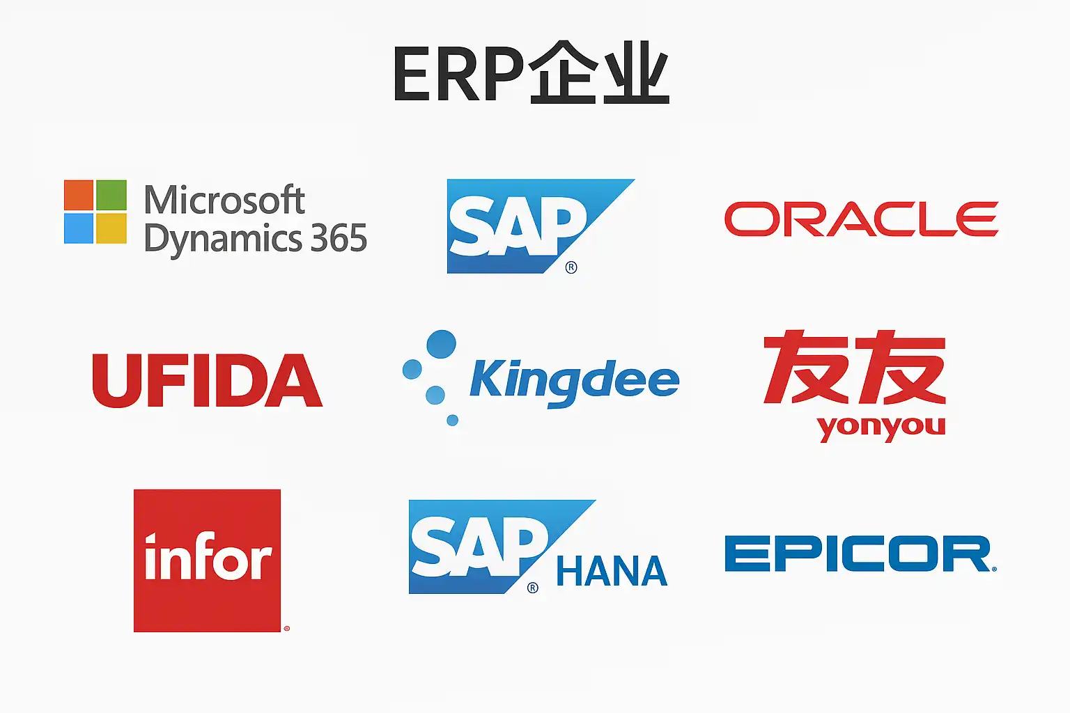 | 公司名称 |-|-| SAP中国 全球最大 ERP 企业,在华深耕多年,本地团队完善 Oracle中国 金融、电信、大制造领域领先 微软中国 云端 ERP 与 CRM 一体化解决方案 用友网络 国内最大 ERP 商业软件供应商之一,各行业全覆盖 金蝶软件 中国 SaaS ERP 龙头,中小微市场领导者 浪潮集团 倾向政府、大制造、大服务等领域 鼎捷软件 制造业细分行业专家 汉得信息 专注于 SAP 等国际品牌本地二开服务 致远互联 OA+协同办公+轻量级 ERP 服务提供者 管家婆 小微批发零售行业普及率极高 纷享销客 移动 CRM 与轻量级业务套件创新者 明源云 地产行业数字化管理专家 易快报 报销费用&费控一体化创新玩家 简道云 灵活低代码平台,自助搭建任意业务场景