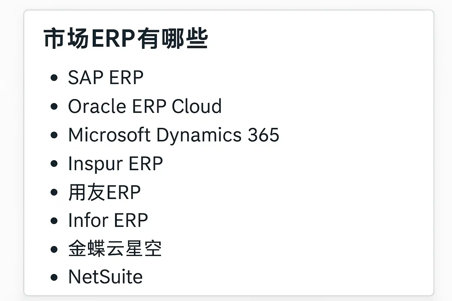 | 国际知名大型ERP | 功能全面,适合跨国/大型集团,价格较高,实施周期长 | SAP ERP, Oracle E-Business Suite, Microsoft Dynamics |