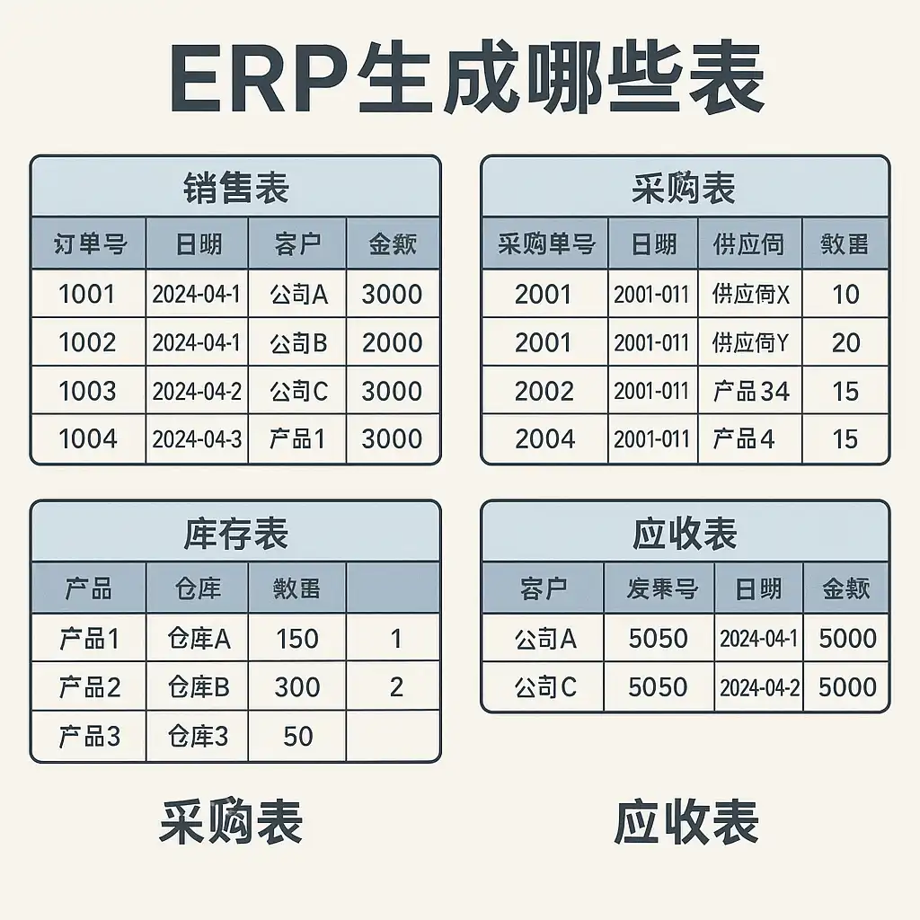 为了实现对企业全流程的精细化管理,ERP系统会自动或按需生成以下几大类核心业务数据表: