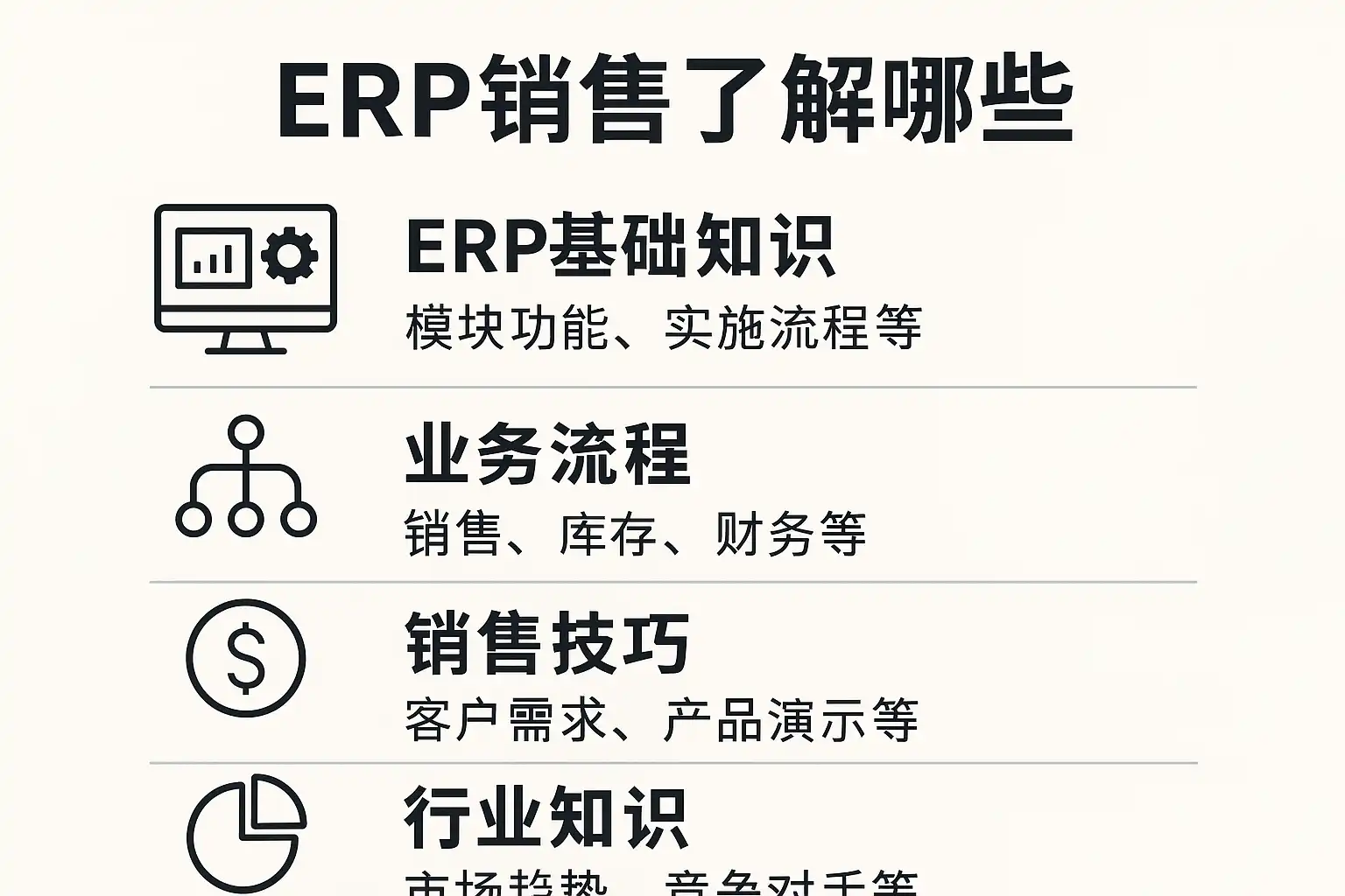 ERP销售需要了解的内容主要包括:1、ERP系统的核心功能模块;2、目标客户群体与行业应用场景;3、产品竞争优势与差异化定位;4、销售流程与售后支持服务;5、价格体系与商务政策。其中,ERP系统的核心功能模块是销售人员必须重点掌握的知识点,它直接关系到客户需求匹配和方案推荐。比如,简道云ERP系统涵盖了采购、库存、生产、财务、人力等多项业务流程,能帮助企业实现一体化管理,提高效率。因此,销售人员应深入理解各模块的作用及其集成方式,以便为客户提供专业的咨询和定制化解决方案。