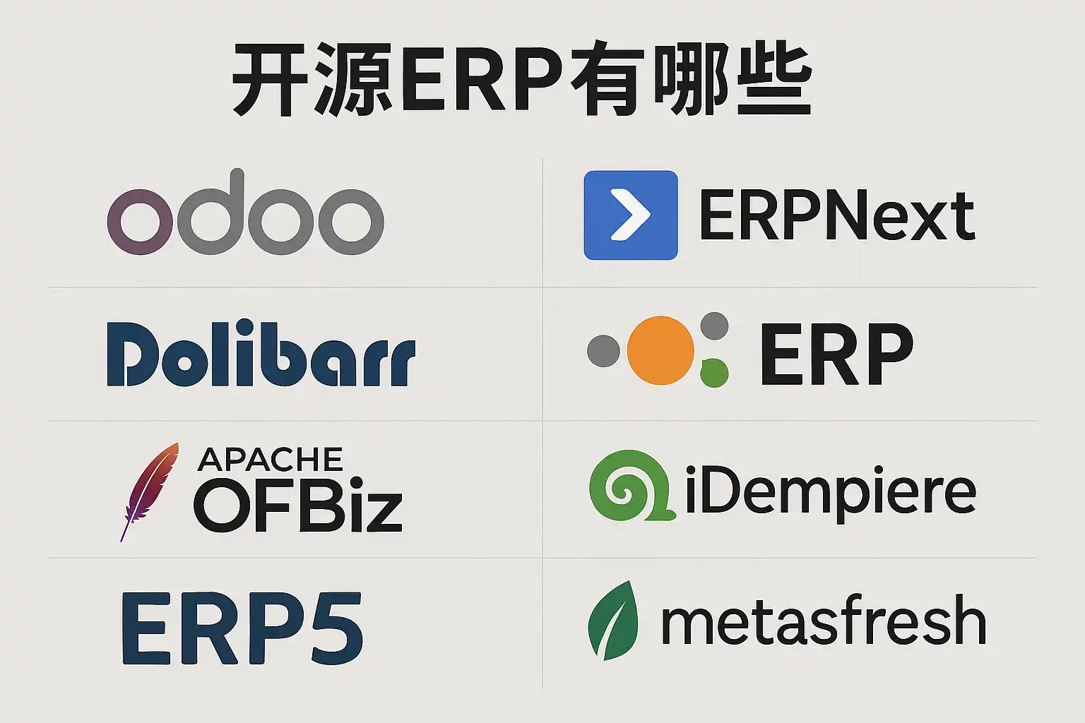 | Odoo | 模块丰富,界面友好,插件众多 | 中小及成长型企业 | Python | https://www.odoo.com/ |